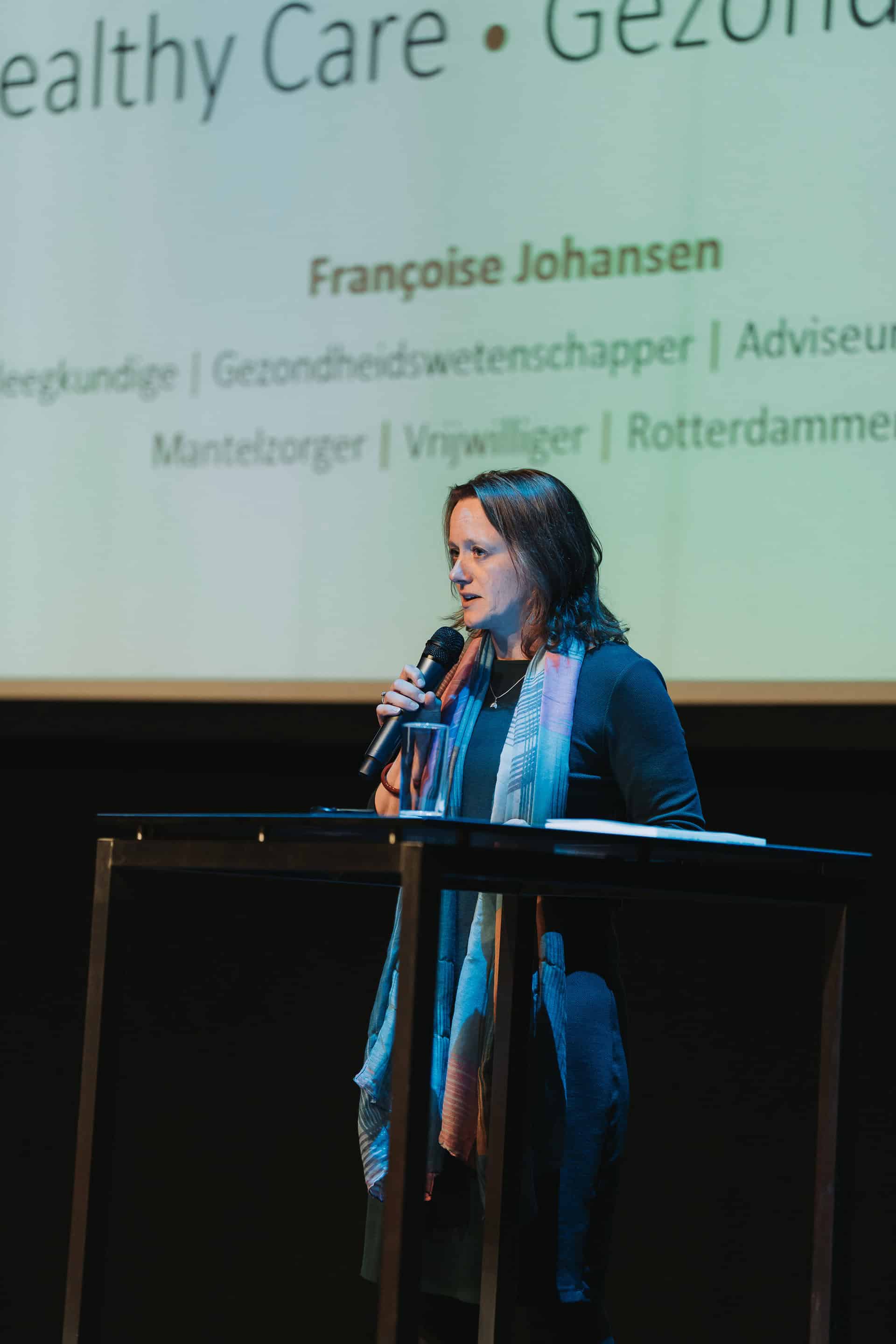 Françoise Johansen presenteerde haar onderzoek naar mogelijke veranderingen in cultuur, structuur, praktijken en bestuur in het verduurzamen van het gezondheidszorgsysteem vanuit een transitieperspectief.